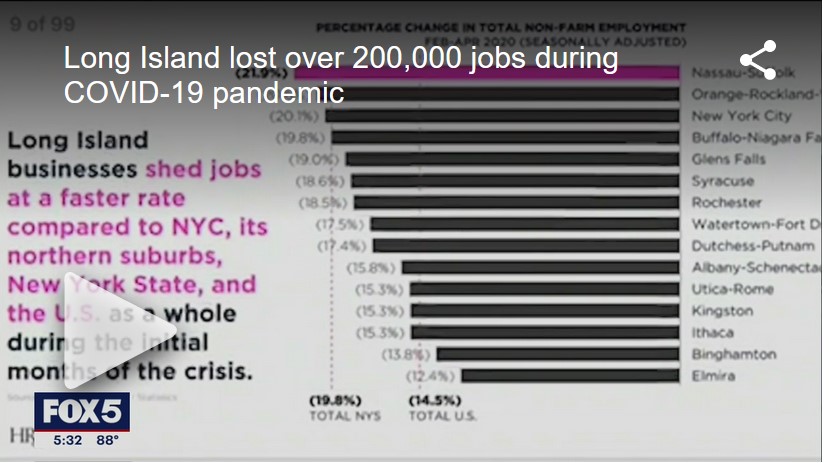 LONG ISLAND - Suffolk County Executive Steve Bellone along with his Nassau County counterpart Laura Curran revealed results of a bi-county study on COVID-19’s economic impact on Thursday. The findings: Long Island shed jobs faster than New York City and any other suburban county in the state.